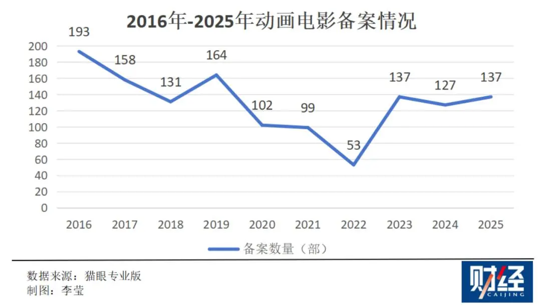 猫眼专业版的电影数据显示,2021年至2025年动画电影的备案数量分别为99部、53部、137部、127部、137部,上映数量分别为65部、46部、63部、55部、57部。尽管疫情后在数量上略有回升,仍未恢复至2019年以前的平均水平。